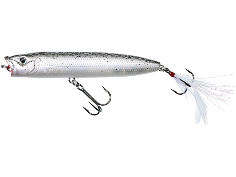 Hladinová nástraha pro lov štik, okounů nebo bolenů. Díky svému rozložení zátěže dobře letí. Střapec peří pro vyšší atraktivitu. Nástrahu oživujte klasickým poppingem.