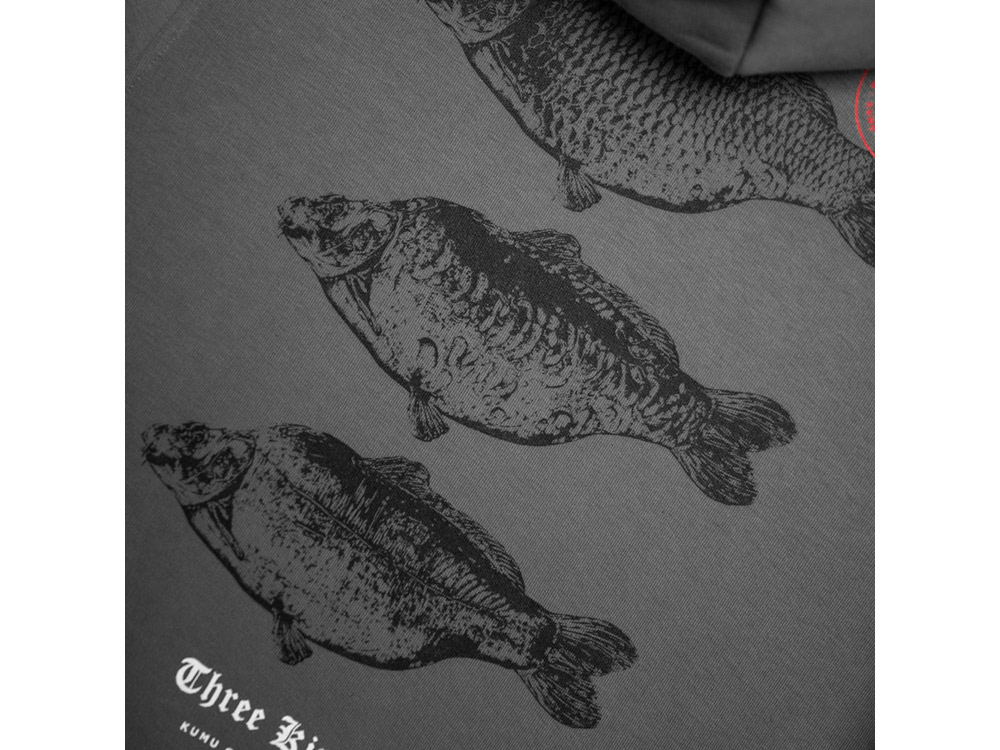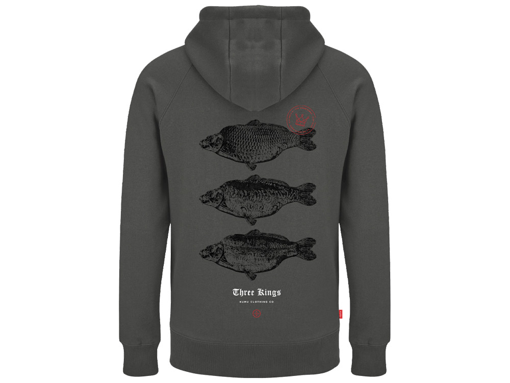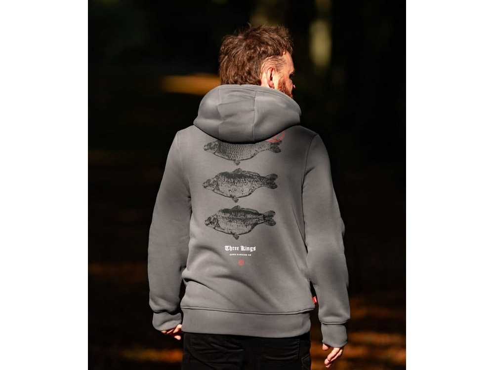 Mikina 3 Kings je ručně vyrobena technikou známou jako „pointilismus“, která využívá miliony drobných teček k vytvoření světlých a tmavých ploch. Oslavujeme 3 druhy kaprů královských, které všichni lovíme. Tříbarevný sítotisk na super měkké organické látce o gramáži 320 g v barvě „břidlicově šedé“ s tkanými bočními klopami.