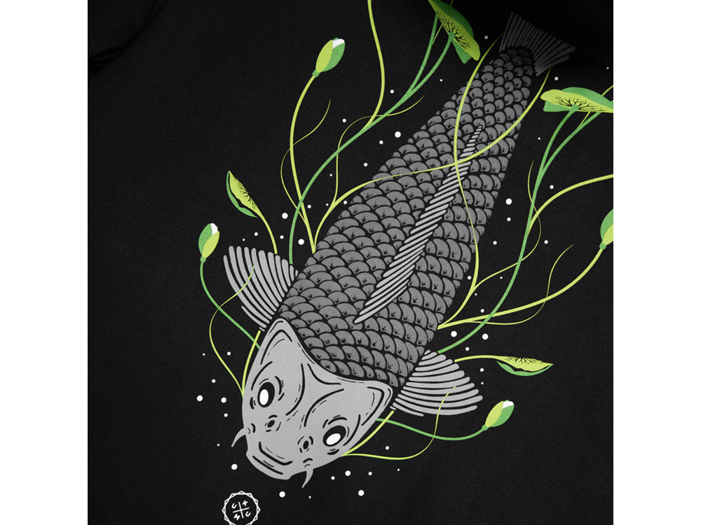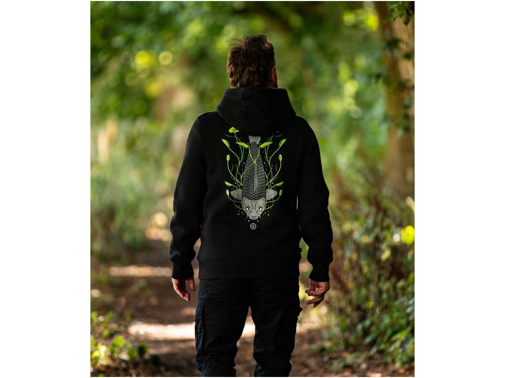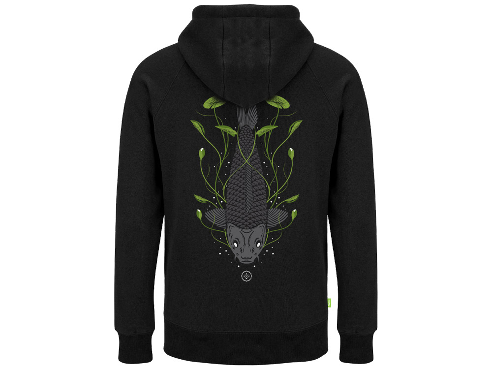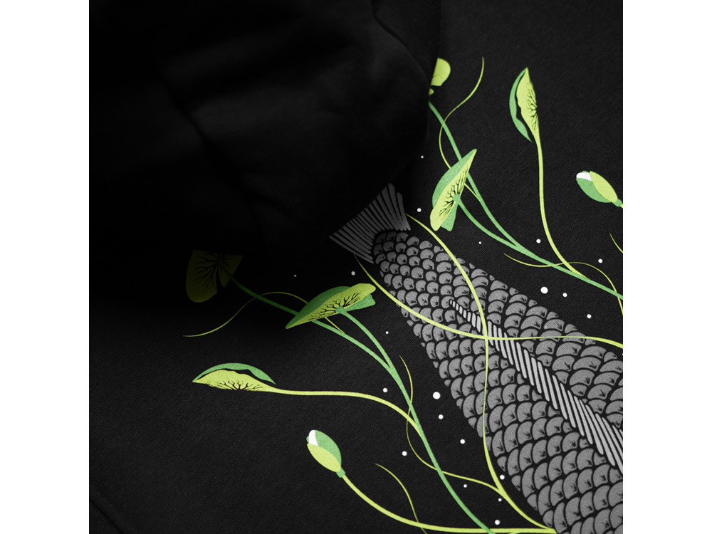 Grafika Tails Up zobrazuje kapra, který se živí mezi lekníny a vysílá oblaka bublin... něco, co dostane srdce každého závodícího rybáře. 5barevný sítotisk s tlumenými šedými odstíny a kontrastní zelenou na super měkké látce o gramáži 320 g/m2 s kontrastními konci šňůrek a tkanými detaily na boční straně.