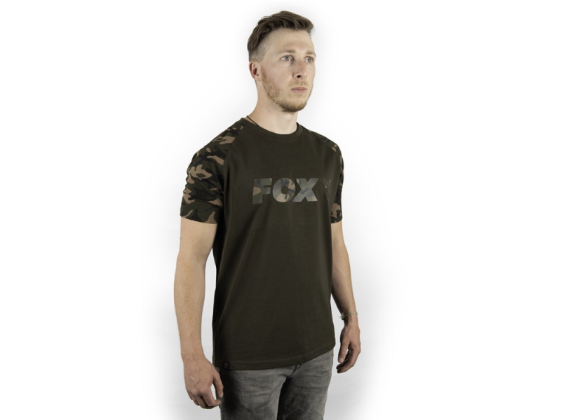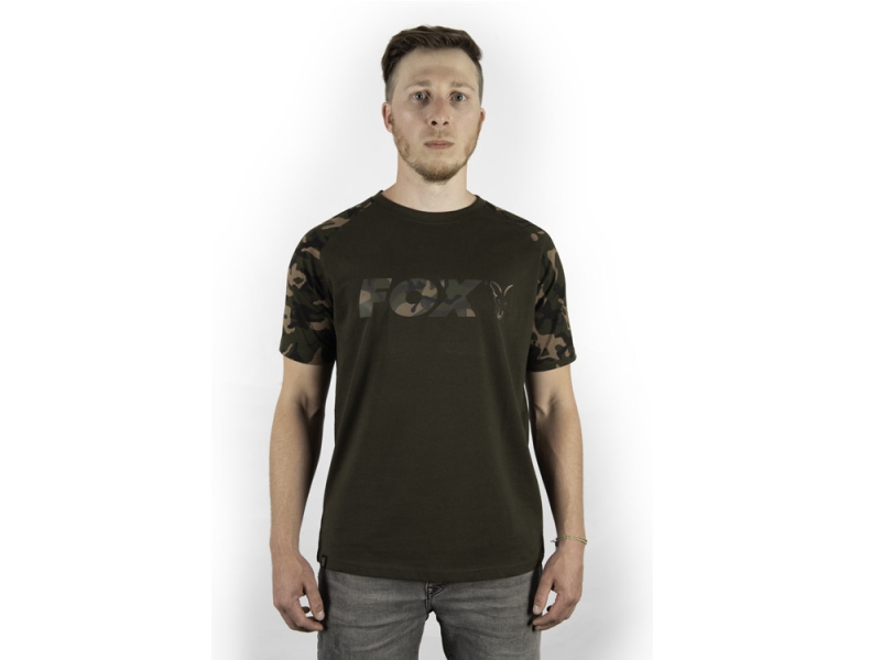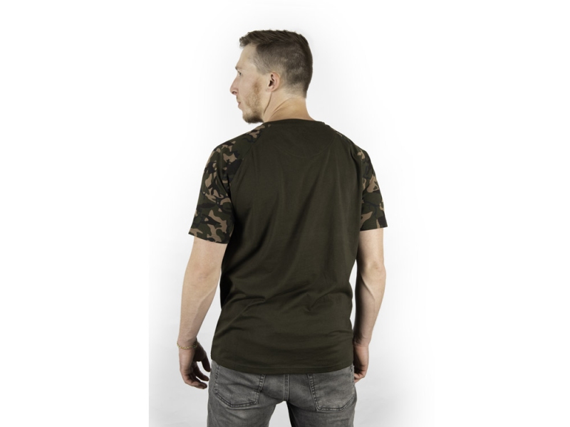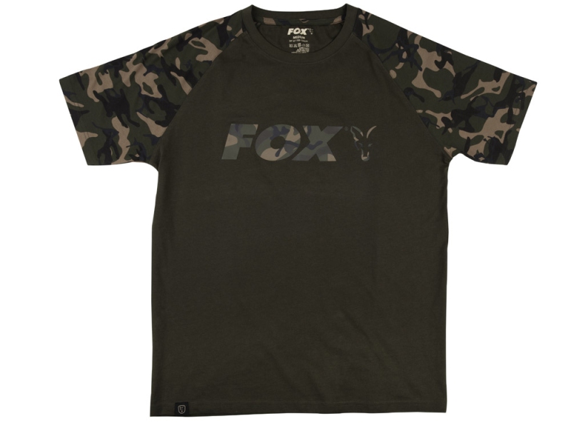 Tričko ve stylu Raglan má tělo v barvě Khaki, Fox Camo rukávy.