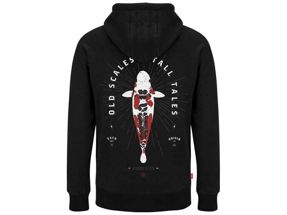 Old Scales & Tall Tales (staré šupiny & dlouhé příběhy). Další kousek, který nás znovu tvořivě žene novými směry a udržuje naše nápady svěží a vzrušující! Na přední straně s designem koi kapra na prsou a na zadní straně velký koi kapr s nápisy.