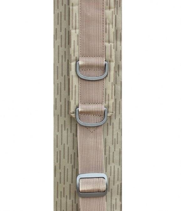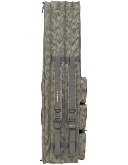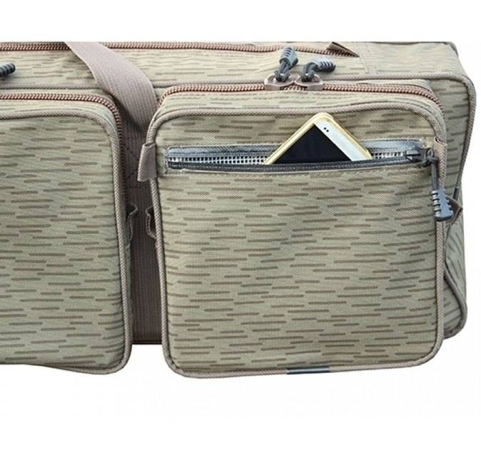 Šířka komory je 11 cm, výška 21 cm se v 80 cm zužuje na 11 cm. To vytváří dostatečný prostor na naviják nasazený na prutu. Na jedné straně je dlouhá kapsa po celé délce obalu 110 x 9 x 5 cm na podběrák a nad ní jsou tři kapsy 20 x 10 x 5 cm na drobnosti nebo na rybářské krabičky. Na druhé straně jsou tři kapsy o rozměru 20 x 20 x 5 cm na drobnosti nebo na rybářské krabičky a jedna kapsa nepromokavá na doklady. Na popruhách jsou čtyři užitečná oka na zavěšení různých potřeb. Všude jsou použity velké pevné zipy s dvěma jezdci, které mají místo kovové rukojeti provázek s plastovým gripem. Obal je ušit z pevného 600D Oxford Nylon materiálu, který je velmi pevný a odolný.